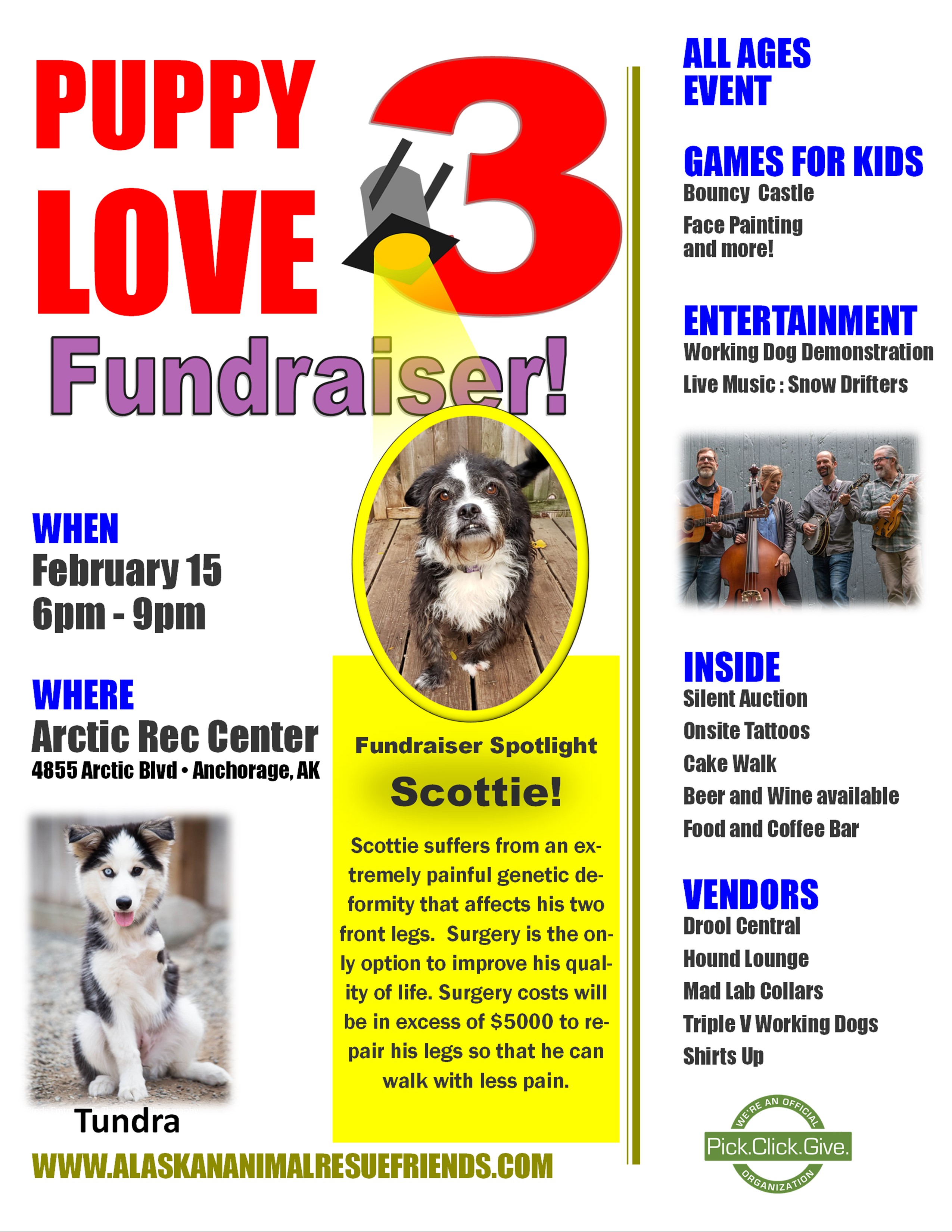 See our events calendar here. Current Scheduled Events: Puppy Love 3 Fundraiser Saturday February 15th, 2020 6:00 PM until 09:00 PM Location: Arctic Rec Center (907) 868-3270 Map: 4855 Arctic Blvd Anchorage AK 99503 Puppy Love 3 Fundraiser!Bigger & Better!!!